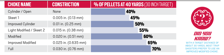 maintain a tighter formation (pattern) for a longer period of time. A choke that is ‘tighter’ (more constrictive) will keep the shot closer together for a longer distance than a choke that is ‘looser’ (less constrictive).
